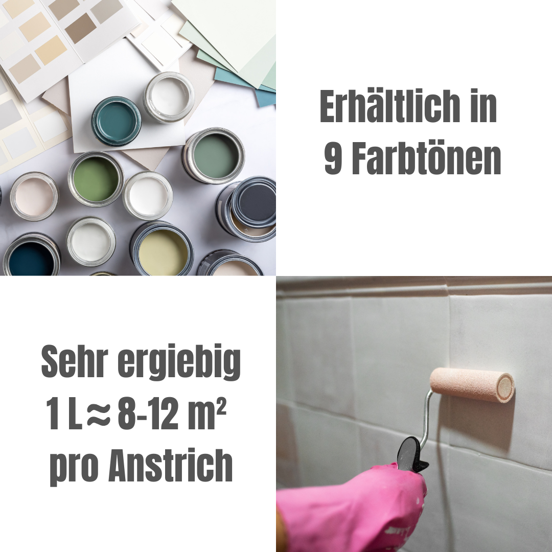 - Verbrauch: Etwa 100 – 150g/qm pro Anstrich, abhängig von der Oberfläche und der gewählten Farbe.